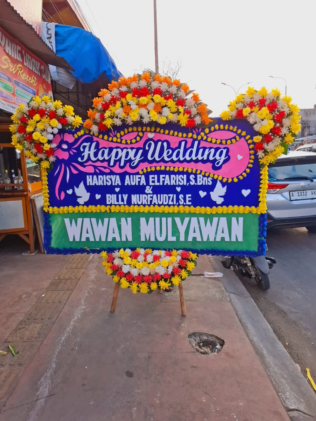 Desain papan bisa disesuaikan dengan nama mempelai, pengirim, serta tema warna yang diinginkan. Cocok untuk dikirim ke lokasi resepsi pernikahan, rumah mempelai, atau gedung acara.